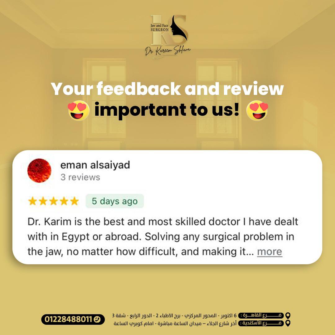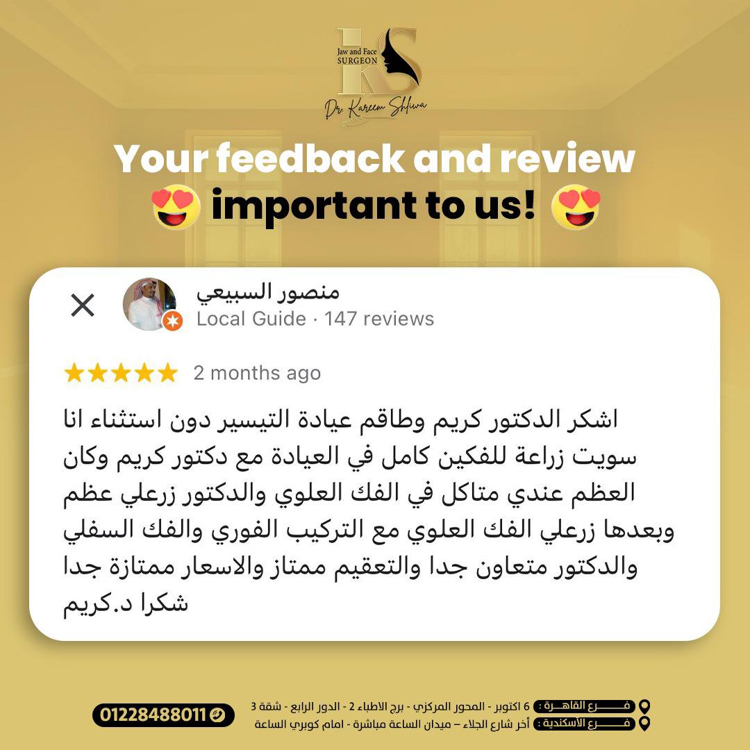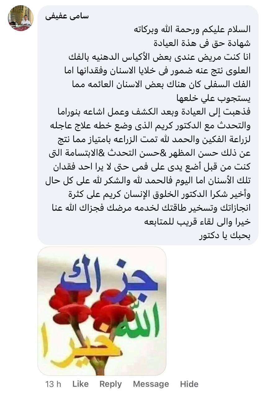والدي كان بيعاني من تلف كبير في الفك بسبب السن، وكنا فاقدين الأمل في حل يريحه. الحمد لله رحنا لدكتور كريم، وبجد كانت تجربة فوق التوقعات عمل زراعة الفك بكل دقة واحترافية، والدي دلوقتي رجع يأكل ويتكلم بشكل طبيعي وكأنه شاب صغير. شكراً يا دكتور على شغلك الممتاز واهتمامك الكبير بحالته.