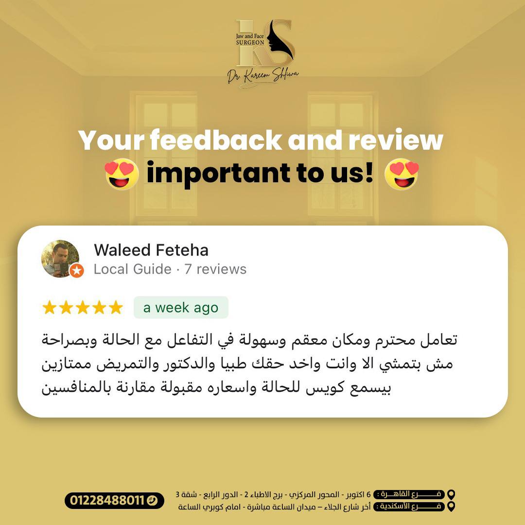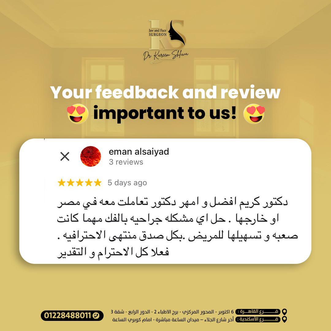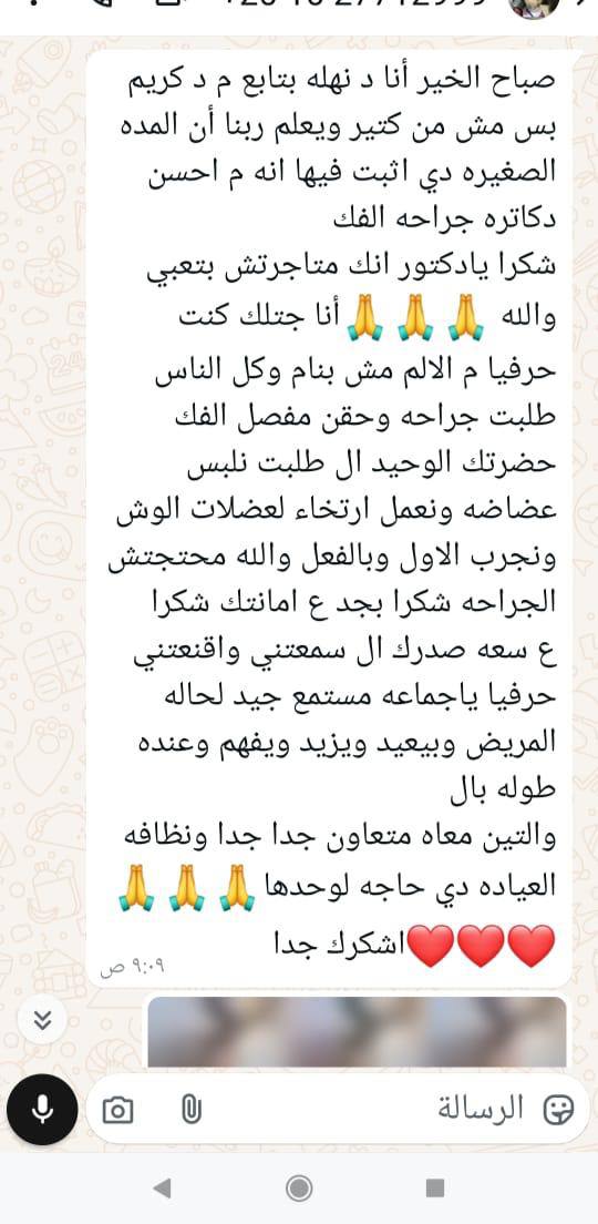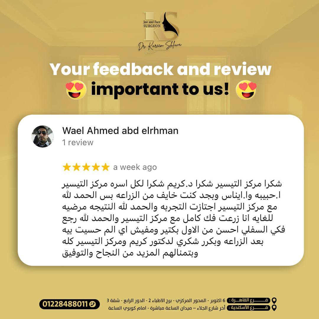 والدي كان بيعاني من تلف كبير في الفك بسبب السن، وكنا فاقدين الأمل في حل يريحه. الحمد لله رحنا لدكتور كريم، وبجد كانت تجربة فوق التوقعات عمل زراعة الفك بكل دقة واحترافية، والدي دلوقتي رجع يأكل ويتكلم بشكل طبيعي وكأنه شاب صغير. شكراً يا دكتور على شغلك الممتاز واهتمامك الكبير بحالته.