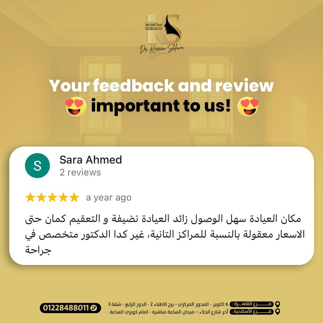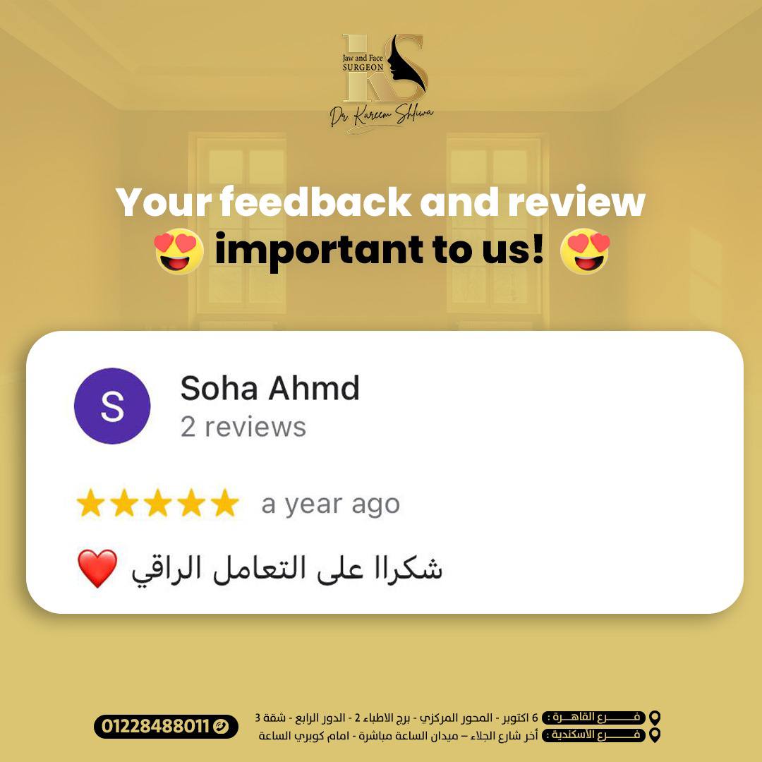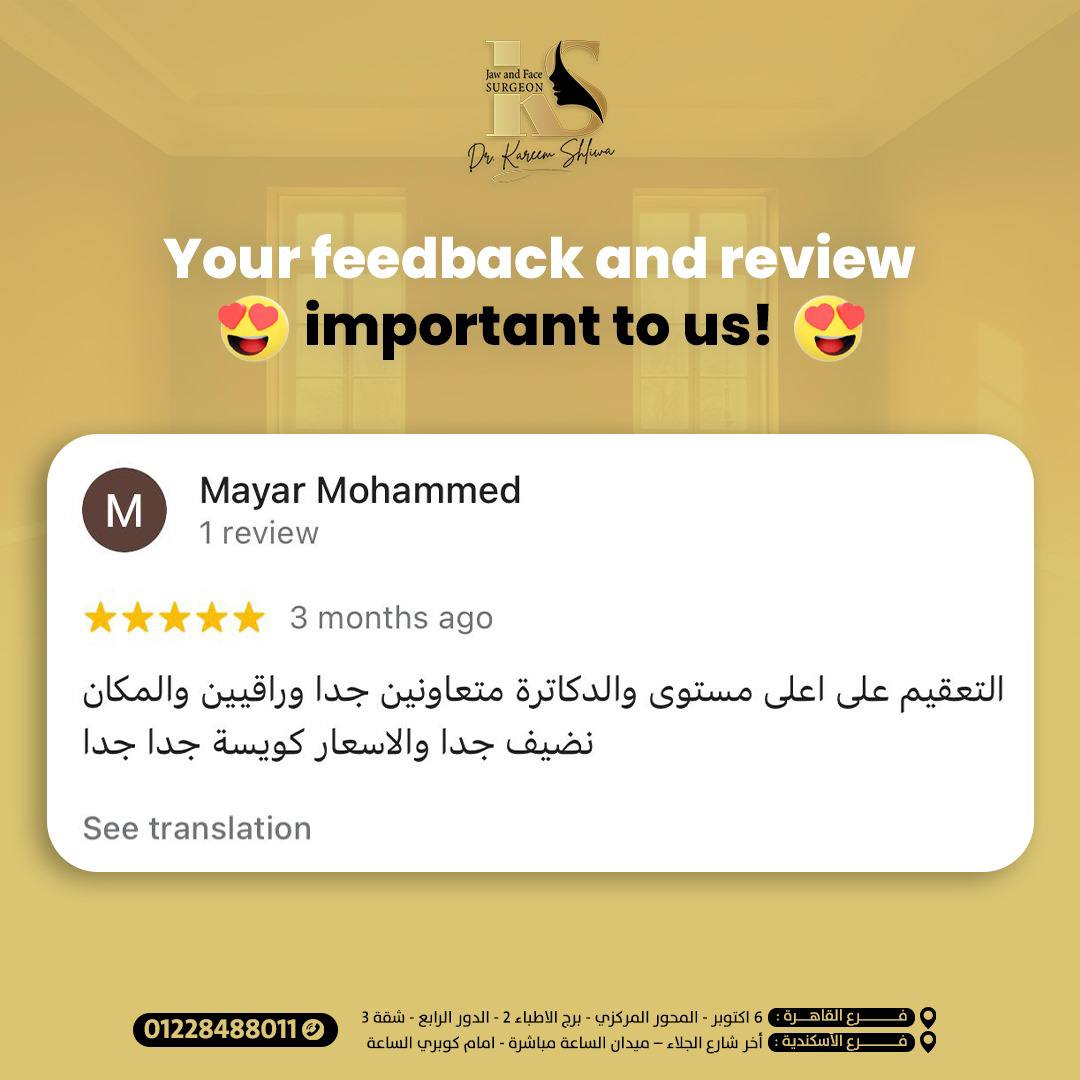 أنا حابة أشكر دكتور كريم شيلوة على خدمة تقويم الأسنان الجراحي، بصراحة شغل فوق الممتاز! أنا كنت محتاجة تعديل في أسناني بشكل كبير، ودكتور كريم عمل معايا شغل رائع وحسيت بفرق كبير في راحتي وثقتي بنفسي بعد العلاج. شكراً دكتور كريم على اهتمامك الكبير، والله يبارك فيك.