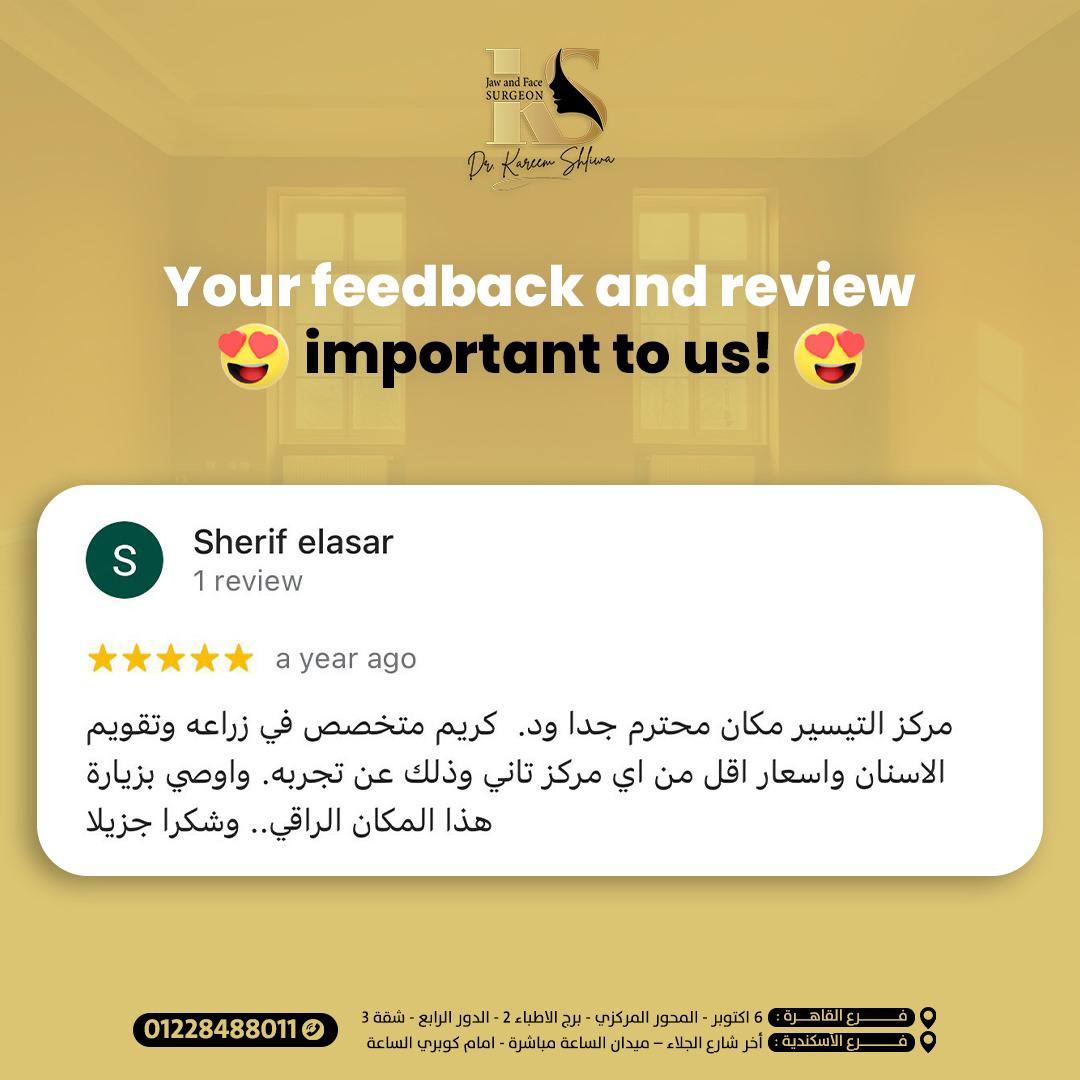 تجربتي مع دكتور كريم في زراعة الأسنان ممتازة، من أول الاستشارة لحد تنفيذ العملية، بيستخدموا أحدث التقنيات والأجهزة والعيادة نضيفة جدا وكل الاستاف لذيذ، شكرا ليكم.